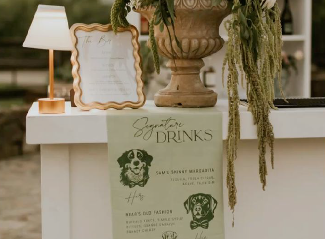 For many couples, their pets are more than just animals—they’re family. Why not make them a part of your wedding day? Custom pet-themed elements like printed napkins featuring your pet’s cute face, cake toppers in their likeness, or bar signage with their names or photos can create a fun and heartwarming touch. These personal details not only bring a smile to your guests but also make your day feel even more intimate and special.